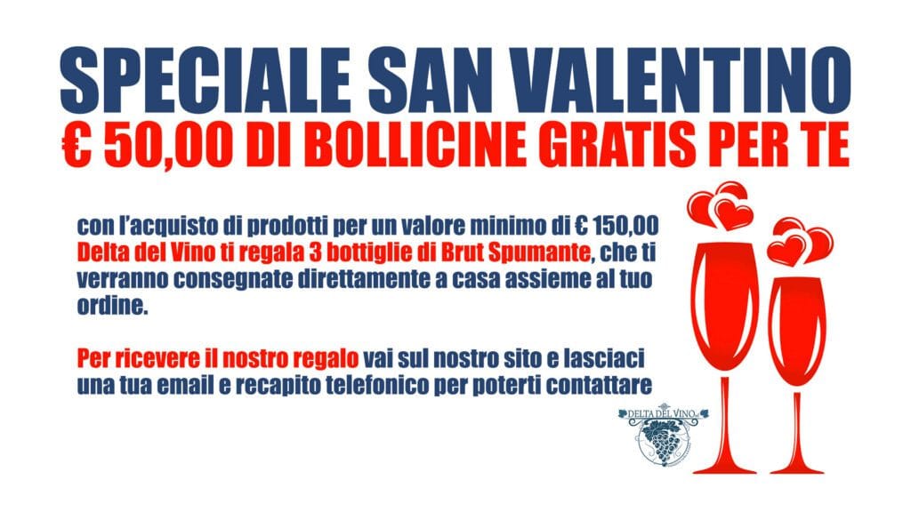 In occasione della ricorrenza della Festa degli Innamorati, Delta del Vino ha deciso di regalare – entro e non oltre lunedì 14 febbraio 2022 – 3 (tre) bottiglie di Brut Spumante per il valore di € 50,00 a chiunque acquisti nostri prodotti per una cifra minima di € 150,00.